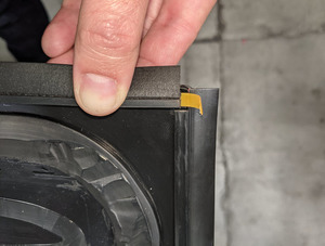 注拉动胶条面玻璃后缘的标签。密封的前侧与第一个垫片之间的间隙将大于后侧。将密封装置对准玻璃角的蚀刻。剥离胶带保护条,并沿着玻璃边缘一次性涂抹几英寸密封层。
