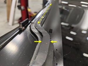 注必要时,使用饰板工具将车顶玻璃密封条固定在挡风玻璃密封条下方的合适位置。