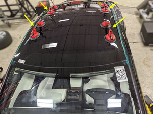 - 在助手的帮助下,在四角将吸盘吸到车顶玻璃上。