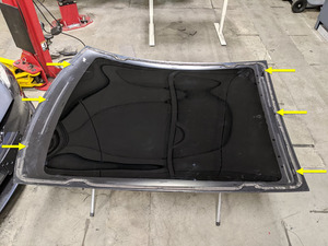 - 在协助下,从车上拆下固定车顶玻璃。