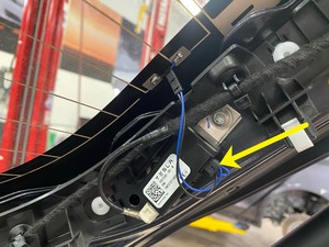 - 断开右侧天线放大器电气连接器,然后使用遮蔽胶带,将线束固定到掀背尾门玻璃上。