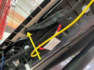 - 使用胶带,将中央高位制动灯 (CHMSL) 线束固定到掀背尾门玻璃上。