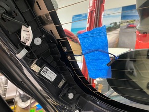 - 断开左侧天线放大器电气连接器,然后使用遮蔽胶带,将线束固定到掀背尾门玻璃上。