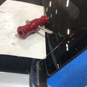 在助手的帮助下,使用 T 柄扳手割开将掀背尾门玻璃固定到掀背尾门的聚氨酯。