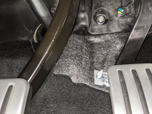 注可能需要向内拉动制动助力器,使螺柱就位。 - 紧固将前地毯固定到踏板总成的卡子,然后向下折叠地毯。