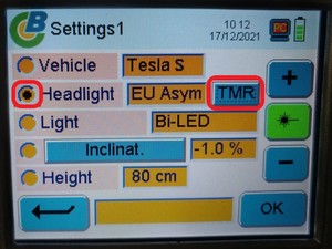 在前照灯测试仪工具上,按下屏幕左侧的左TMR按钮,然后按下屏幕底部的TMR按钮。