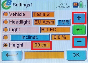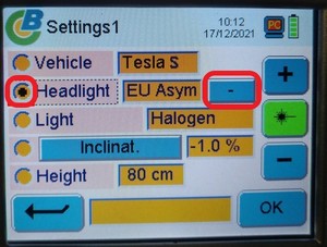 使用方向盘上的左侧滚轮调节光束等级。调节至规格范围内后,前照灯测试仪工具上的光束指示器颜色将从红色变成绿色。