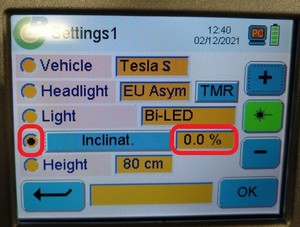 - 选择Inclinat.,然后使用+或-按钮将倾角设置为0.0 %。