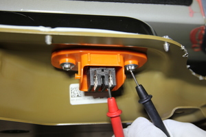 注操作高压部件时,务必佩戴个人防护装备(高压手套、护目镜),测量 B+ 至接地、B- 至接地、B+ 至 B- 的电压;如果电压大于 10V,则说明电池组触点开关未断开或熔焊;停止工作并联系服务工程部。
