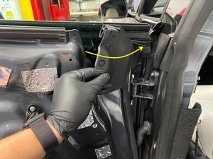 - 将左侧后门二次密封条对准车门总成,然后安装连接密封条与车门的卡子(11 个)。