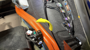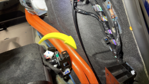 注Return the harness to its original routing: Harness sits in front of the busbars.注Fully engage the connector and red locking tab.