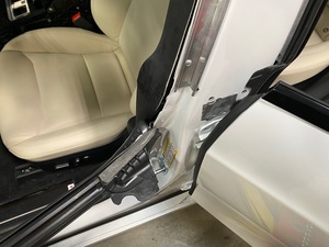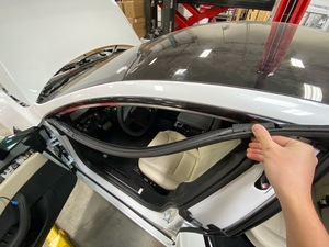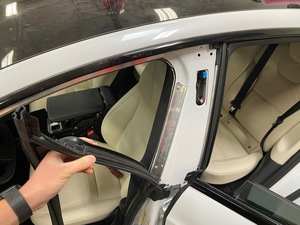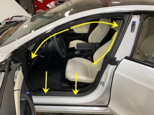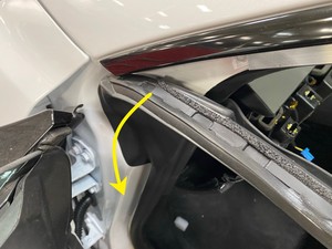 将左侧车身前侧主密封条对准车辆,将卡子(5 个)紧固到车身,然后剥掉胶带保护条,沿安装路径将密封条粘到车身。