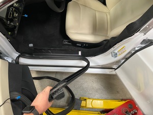 使用异丙醇 (IPA) 湿巾清洁左侧车身前侧主密封条拆下后的残留物。