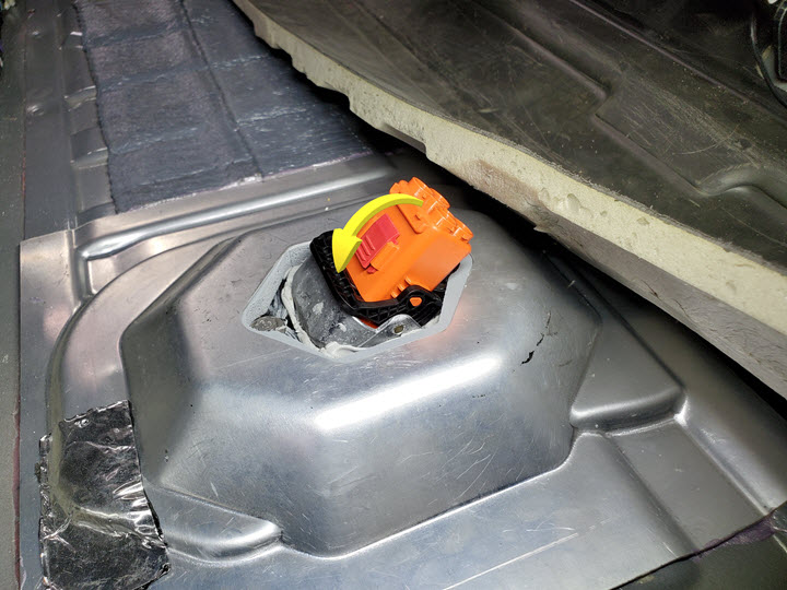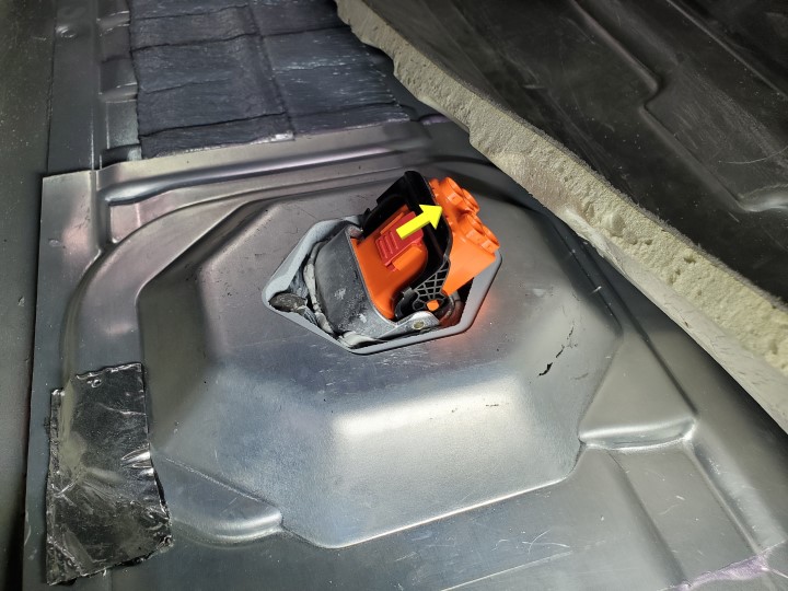 - 拉出红色锁片,然后再次拉动锁片,以断开电气线束与高压电池逻辑连接器的连接。