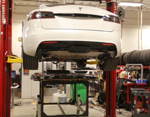 - 在助手的帮助下,将高压电池和工作台移到车辆下方。