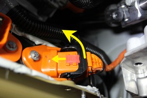 - 滑动红色连接器锁片,打开黑色释放杆,然后从高压电池压缩机高压接头上断开压缩机高压线束。