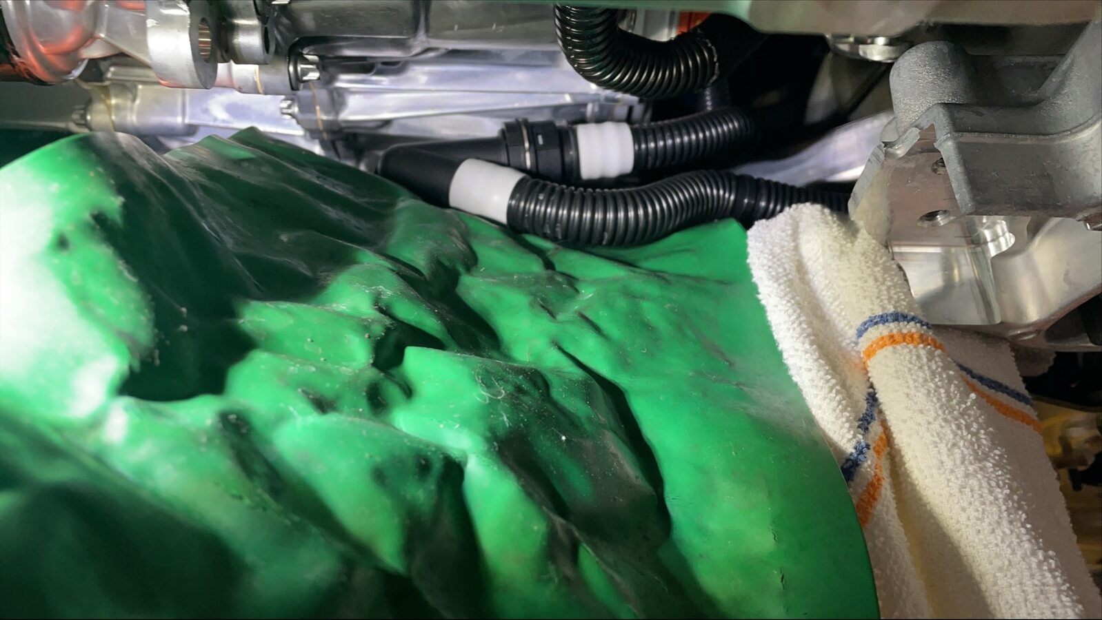 - 仅限 Plaid 车辆 - 在高压线束连接器上方和功率转换系统冷却液回路软管下方放置一个可折叠漏斗和吸水性材料,将冷却液引出高压电池。