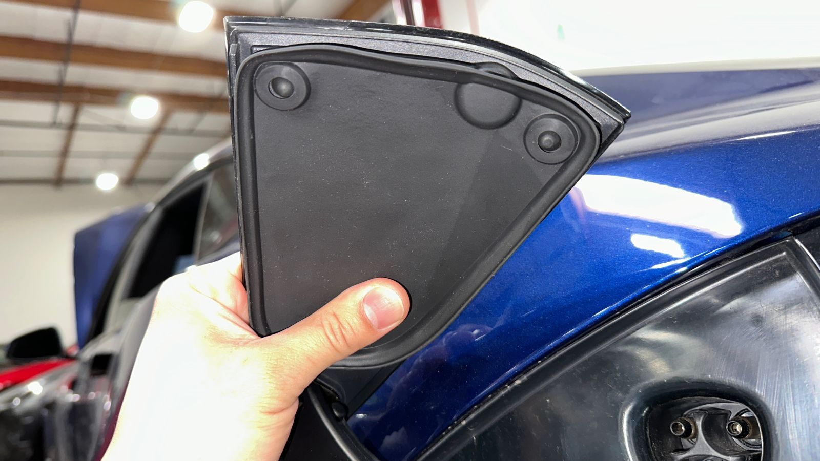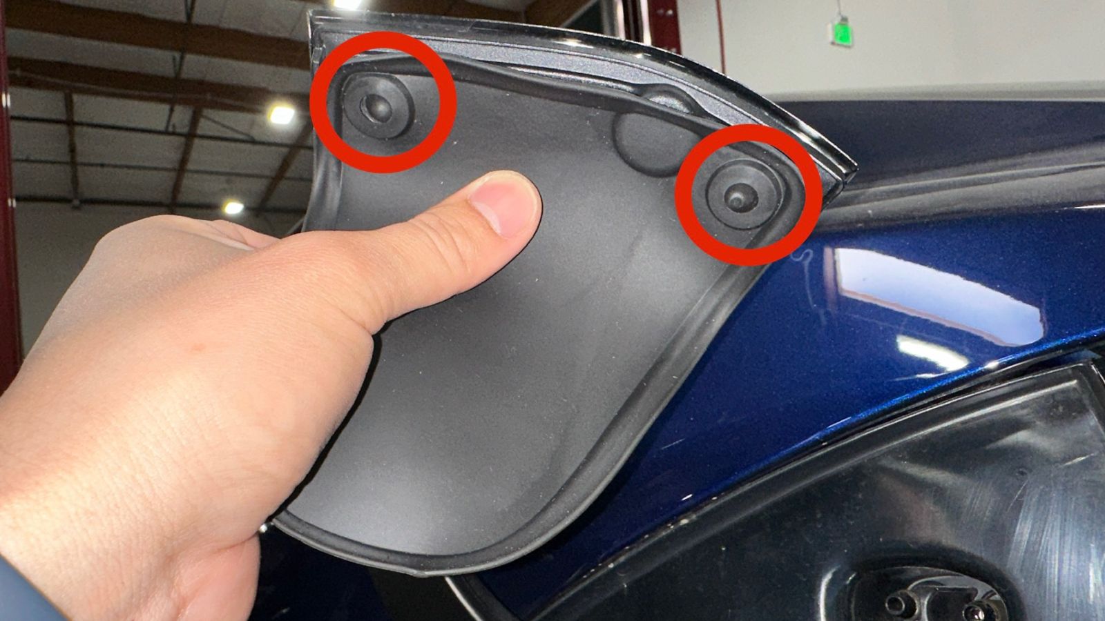 - 去除充电接口盖板密封件粘合剂上的塑料,然后将密封件与充电接口盖板上的橡胶缓冲止动块对齐。