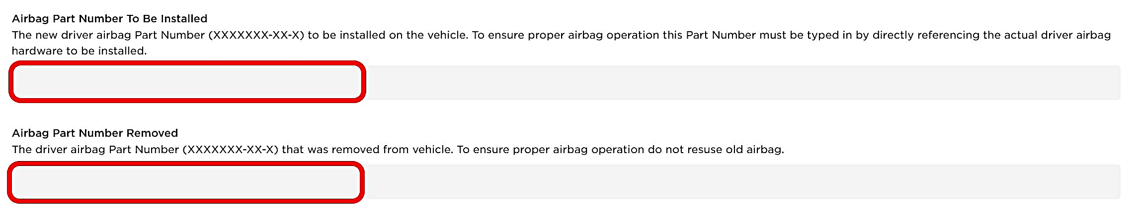 - 在打开的窗口页面上,输入已安装且兼容的新安全气囊的零件号,再输入已拆卸的旧安全气囊的零件号。