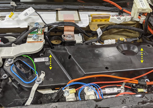 将功率转换系统安装托盘从前高压电池仓区域拆下。