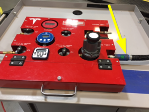 - 将压力测试固定装置软管固定至泄漏测试适配器。