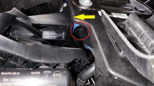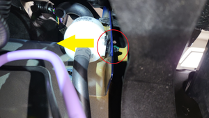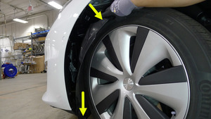 - 拆下将左侧前轮拱内衬固定到前饰板的推拉式卡子(5 个),然后将轮拱内衬移到一旁,以便于操作。