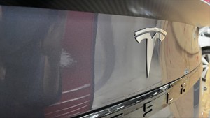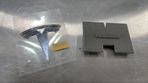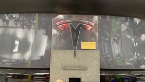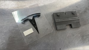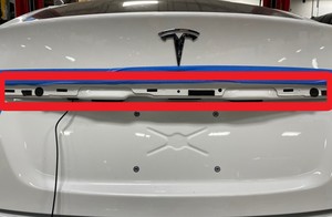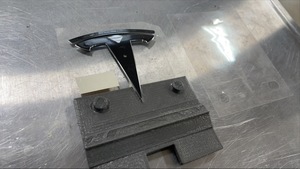 将带膜的 Tesla 车尾标固定在车标对齐工具上