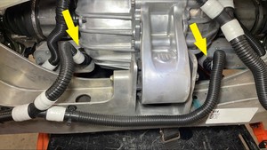 - 从接头上取下塞子,立即将后驱动单元出口软管连接到左右热交换器,紧固卡子(2 个),然后对接头执行推拉推测试。