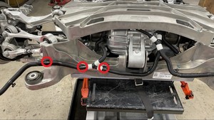 - 松开将后驱动单元出口软管固定到后副车架的卡子(3 个),然后将软管从副车架上拆下。