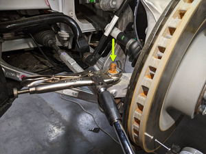 注5 个螺母注这将模拟正在安装的车轮,从而防止测量不准确。 - 将制动盘偏转挠性杆安装到前横拉杆螺母上并设置用于读取。