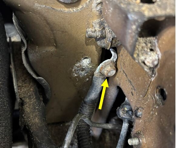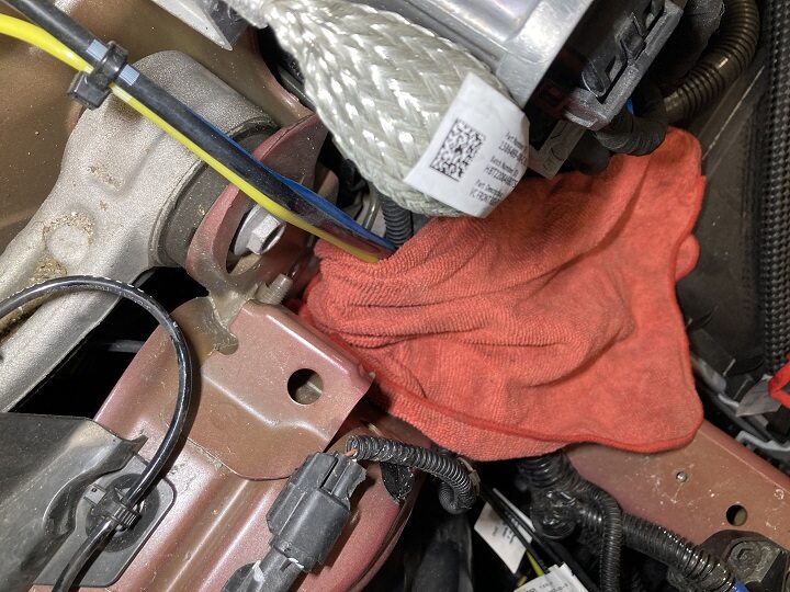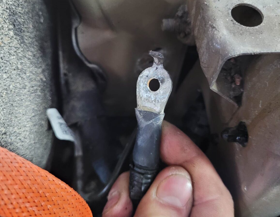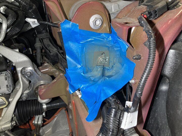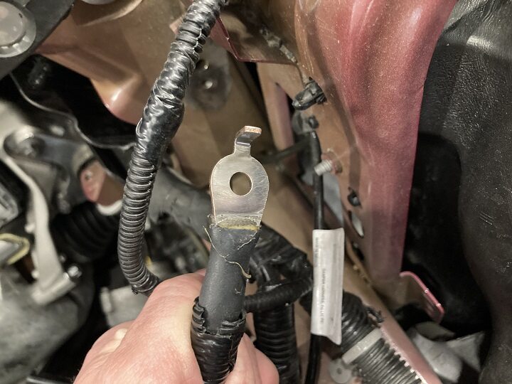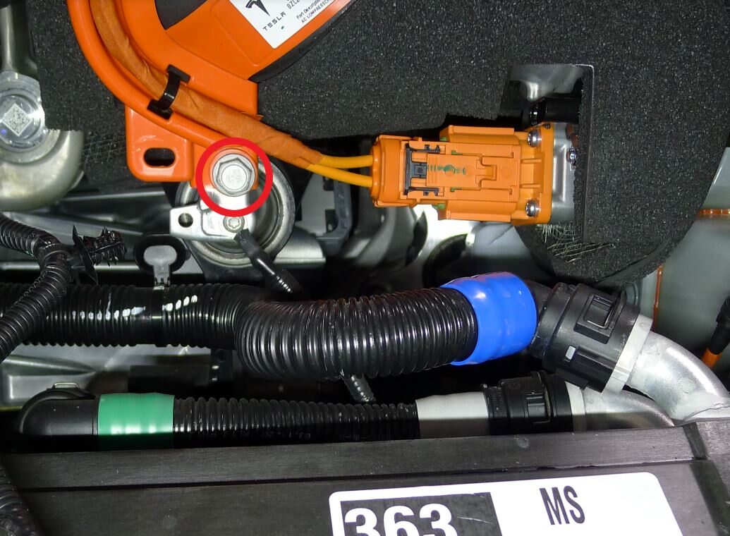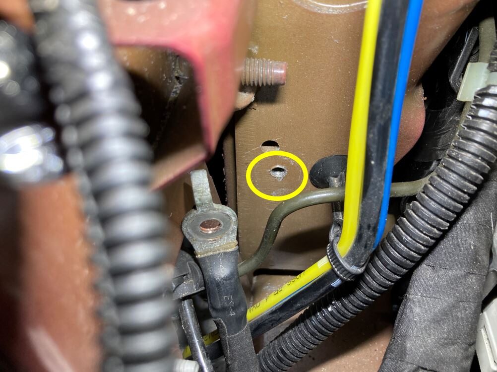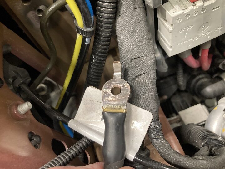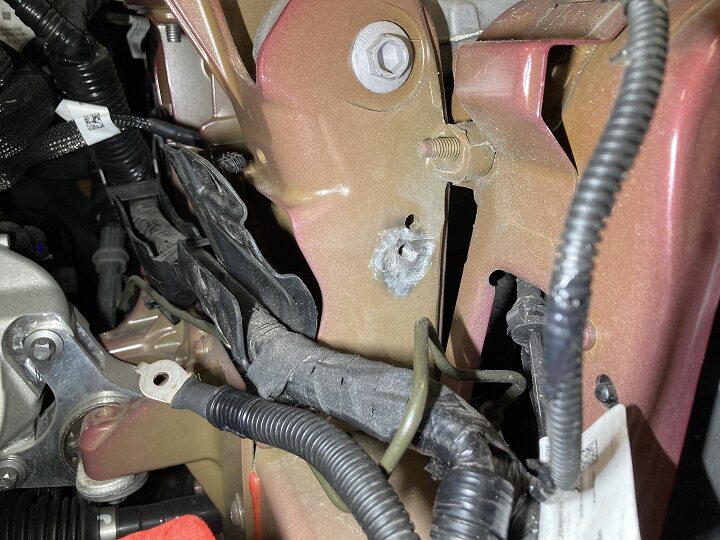 - Remove the broken bolt head from the frunk harness ground terminal G625.