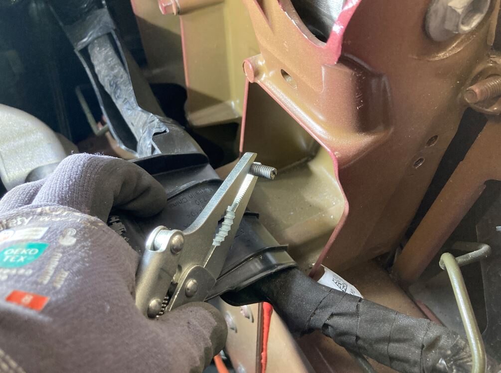 注Use locking pliers to remove the stud, turning it clockwise viewed from the front of the vehicle. Move the frunk harness front guide aside as needed.