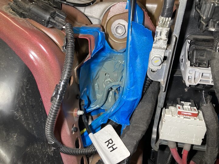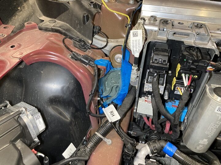 - Install a new bolt that attaches the frunk harness ground terminal G625 to the LH crash rail (torque 8 Nm).