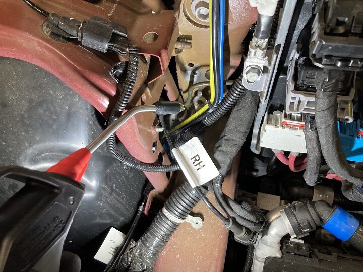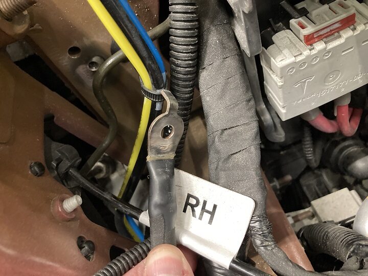 - Remove and discard the bolt that attaches the frunk harness ground terminal G626 to the RH crash rail.
