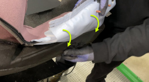 - 小心地将气囊滑槽放入座椅靠背泡沫的左侧,然后将座椅靠背饰板折叠到左侧侧承梁上。