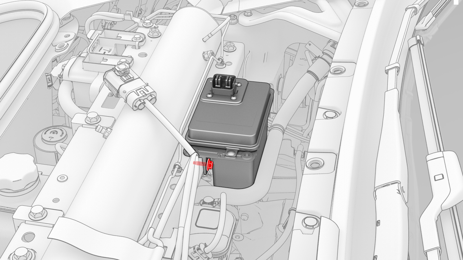 拆下将低压电池固定到空气悬架储气罐的螺栓(3 个),然后将低压电池向下移动到储气罐后,为拆卸高效分子空气 (HEPA) 过滤器盖留出空间。
