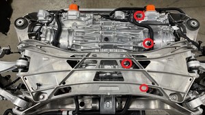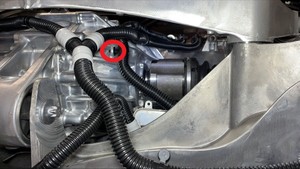 - 紧固将后驱动单元变流器进口软管固定到变速箱左侧的卡子。