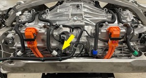 - 将后驱动单元左侧变流器至热交换器软管安装到副车架总成上,然后紧固将软管固定到后驱动单元的卡子(4 个)。