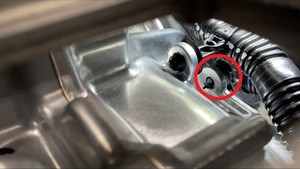 - 松开将后驱动单元变流器进口软管连接到变速箱左侧的卡子,然后将软管移至一旁。