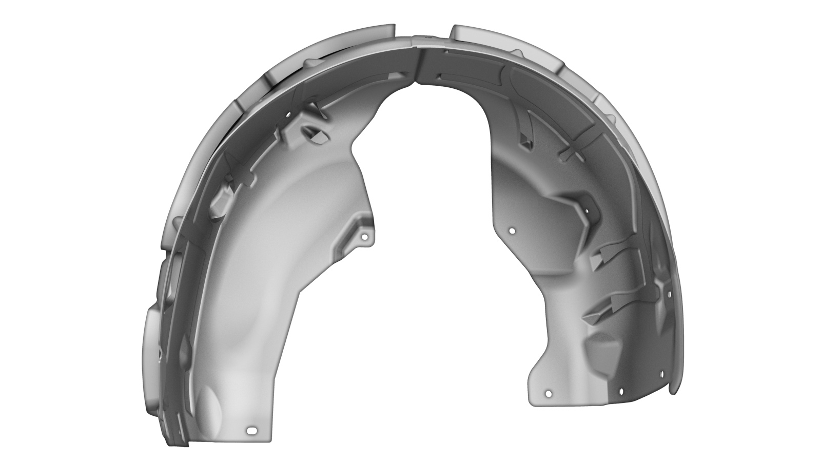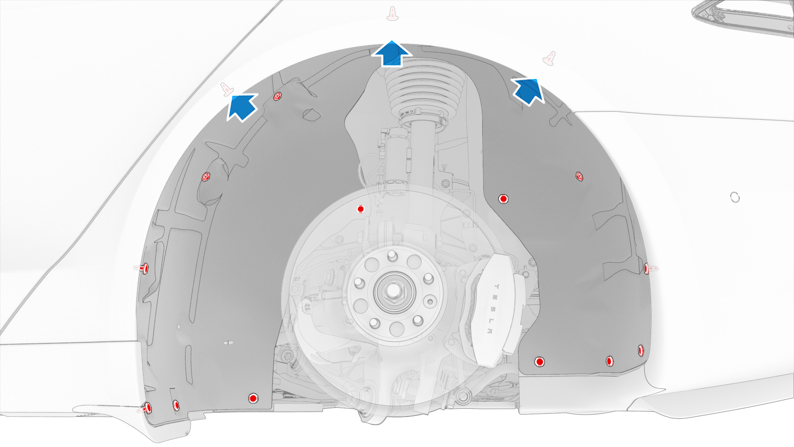 - 将左侧后轮拱门衬垫安装到左侧后轮拱门中,然后将衬垫与车身连接的推拉式卡子(13 个)和风扇夹(3 个)固定。