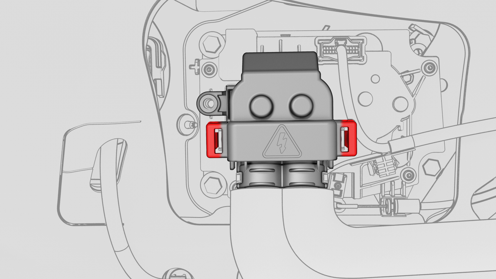 - 将充电接口安全盖放置在充电接口总成上,然后安装将安全盖固定到充电接口总成的锁片(2 个)。