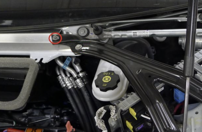 - 将清洗器软管喷嘴安装在左侧减震塔盖附近。