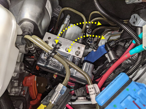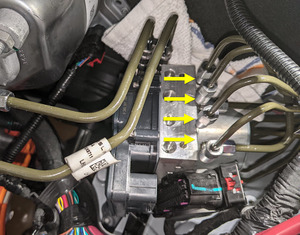 - 将制动管路(2 条)固定到液压控制单元 (HCU) 管束的底部。
