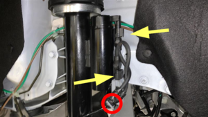 - 断开电气线束与 LH 后主动减震器连接器 (x2) 的连接,然后松开将电气线束固定到减震器的索环。