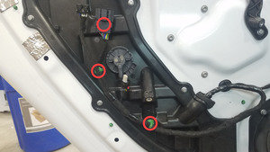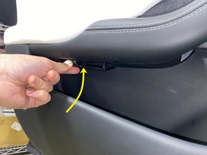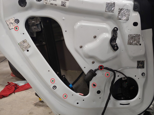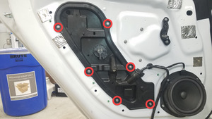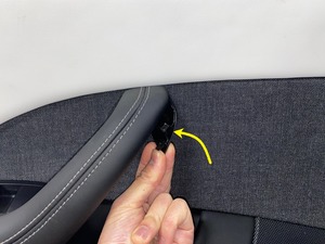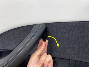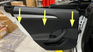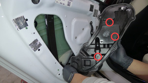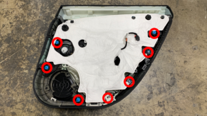 Remove fasteners securing LH rear door panel under armrest and door trim handle