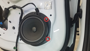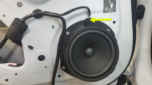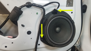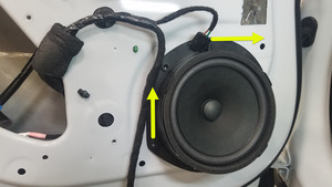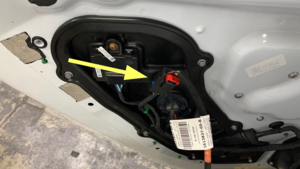 注Push both rubber grommets into LH rear door with harness pass through and connector.