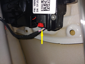注7x clips, 1x connector, Pull bottom of door panel to release clips then lift panel up to disengage from inner belt seal, Pull red tab to disengage lock then disconnect door harness