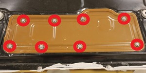 - 拆下并弃用将高压电池后检修板固定到高压电池的螺栓(8 个)。