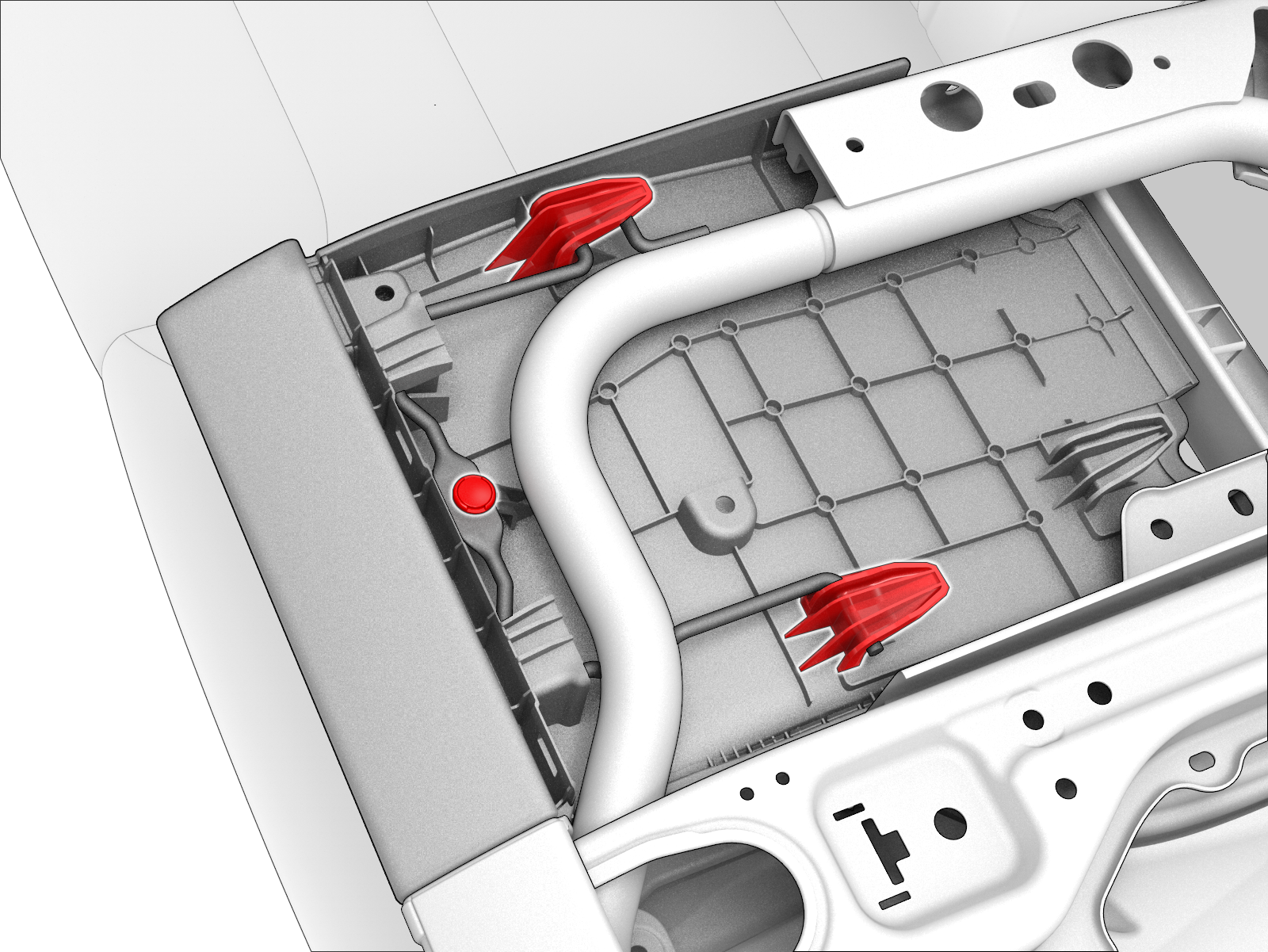 - Position the center armrest closeout tabs on to the backrest frame, and then install the clip that attaches the center armrest closeout to the backrest frame.
