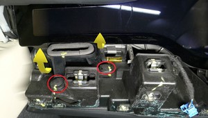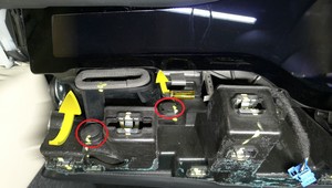 - 拆下固定左侧车窗除霜器导管的铆钉(2 个),然后将导管向上旋转出仪表板风管,将其从车上拆下。